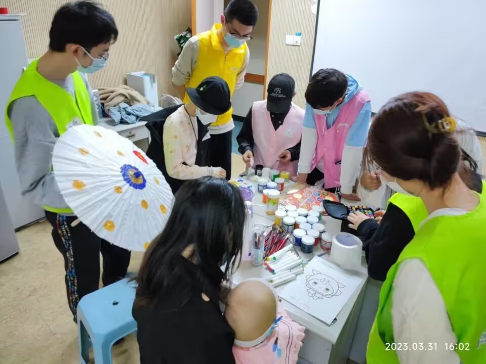 这次的志愿者都是第一次进行志愿服务,众人新奇又激动。负责人将我们分为了三组,每组两人,一组在肿瘤外科进行服务,她们先是将有所损坏的书架修理好,继而把图书分类整理到了书架上。做完这一切,她们进入病房邀请小朋友来活动室参与活动,协助小朋友签到,教小朋友写字时的她们就像悉心陪伴弟弟妹妹的大姐姐一样。在这之后,她们陪伴和帮助患者小朋友们用油画颜料画油纸伞,虽然略显笨拙,但是他们的开心有目共睹。其他两组来到了血液科,她们将走廊图书角里的图书一本本码放整齐,然后观察每一个病房,看看是否需要帮助,却没能帮到人,略显遗憾。