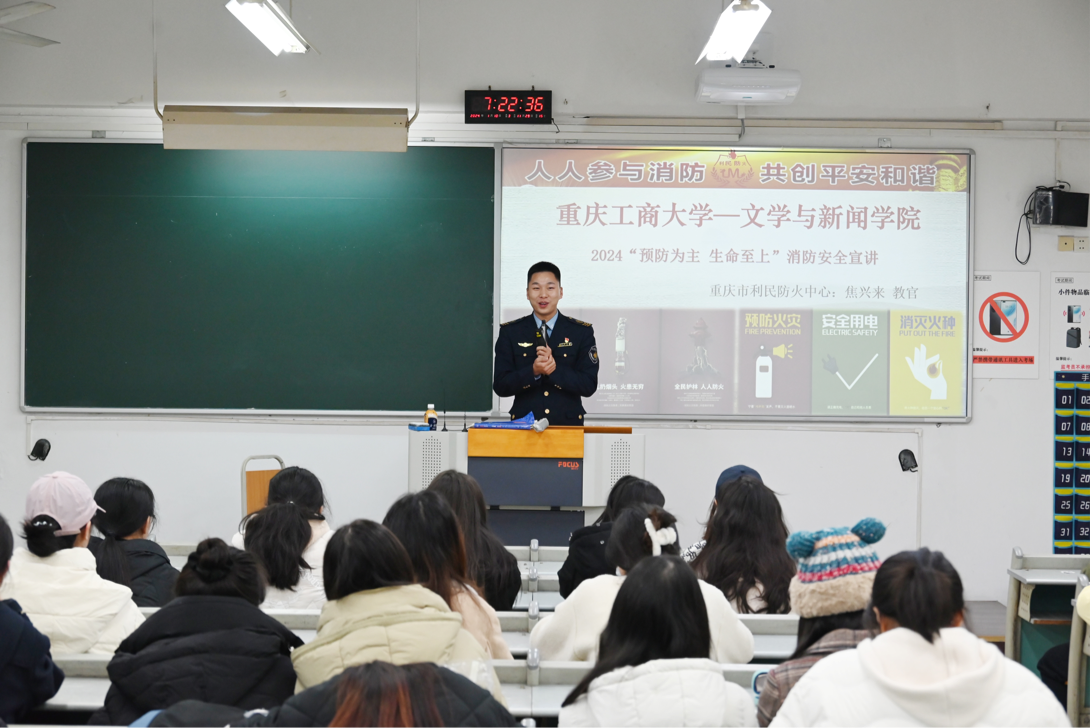 重庆市利民防火中心焦教官给同学们进行了“预防为主,生命至上”的消防安全宣讲,他结合消防安全制度以及近年来发生的各类火灾案例,从消防意识、消防知识、逃生注意事项等方面进行讲解,让同学们了解急救法及如何使用灭火器、水带等消防工具。