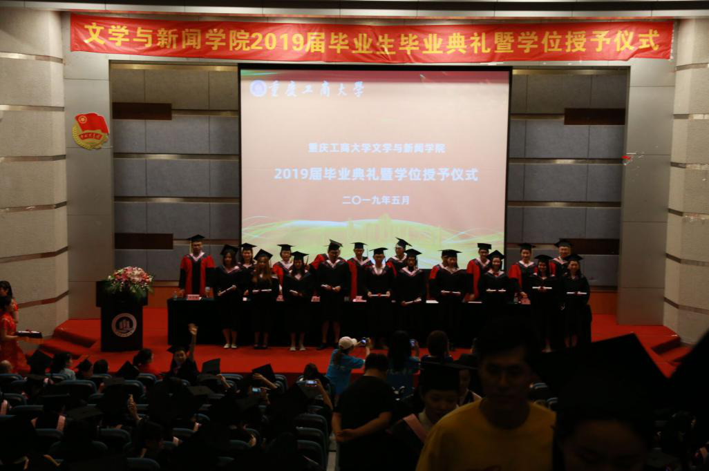 典礼在视频《文新之约—致2019届毕业生》中拉开帷幕。随后,李华平副书记宣读《公司关于表彰2019届优秀大学毕业生的决定》,刘宏毅副经理宣读《公司关于表彰2019年员工考研的决定》,主席台领导和嘉宾为5名重庆市优秀毕业生,38名校级优秀毕业生,27名考取研究生毕业生颁发荣誉证书。主席台院领导和嘉宾为466名本科毕业生扶正流苏,并与他们合影留念。