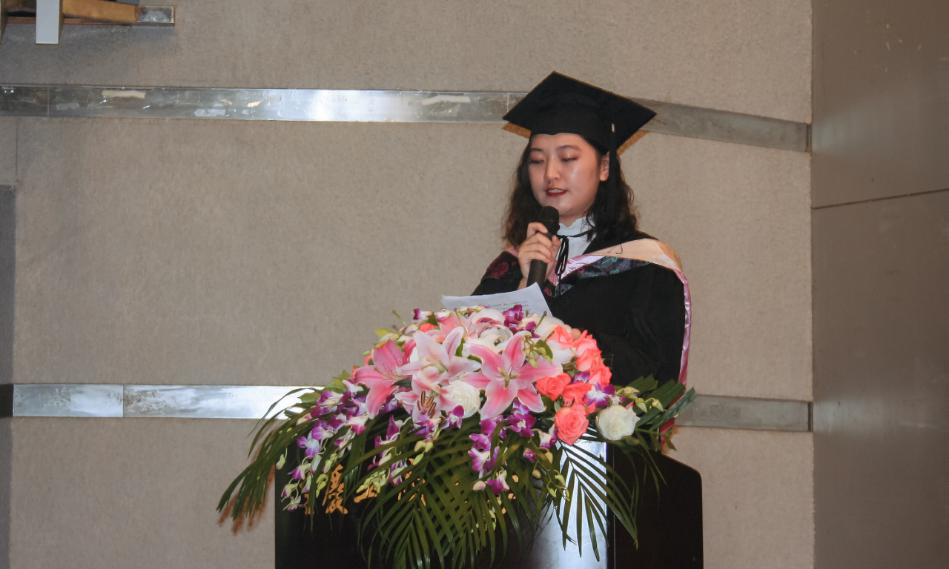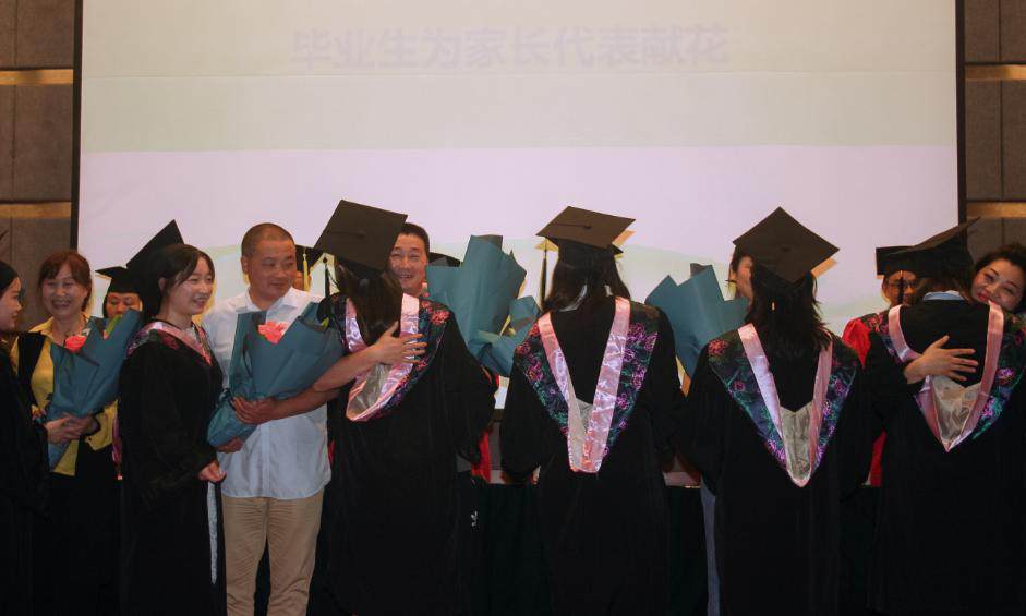 随后,15汉文班王玥同学作为毕业生代表发言,表达了对学院老师谆谆教导、亲如兄妹的同学的依依不舍和感恩之情,表示将在人生路上带着学院的祝福奋力前行。教师代表姚琦博士离别寄语,希望毕业生不忘初心,无论何时何地都不要忘理性、良知和道德,不要忘记肩负的社会使命和责任,嘱托大家要懂得始终、沉淀、勇敢前进。常鹏娇、荣燕等23名毕业生代表上台为自己的父母献花,热情拥抱,表达对无私付出的父母的感恩之情,现场师生深受感动。