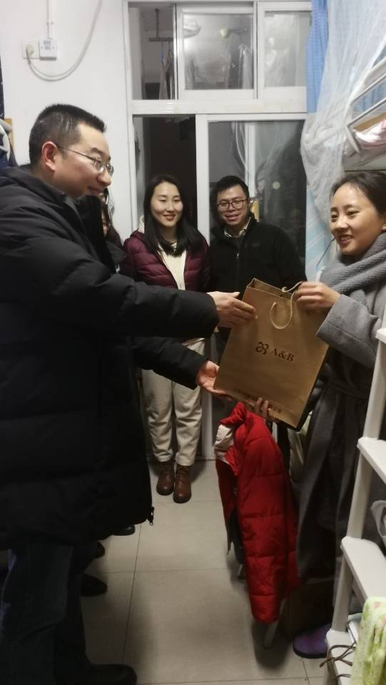 12月31日,公司党委副书记李华平带领学工办全体辅导员深入员工寝室,将学院统一购买的保暖内衣送到15名贫困员工手中。