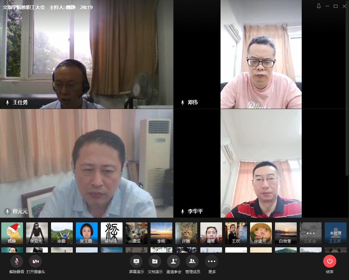 2020年7月17日下午,美狮贵宾会通过企业微信平台召开了期末全院教职工大会。学院新任班子成员及全体教职工参加了会议,会议由学院分党委书记李华平主持。