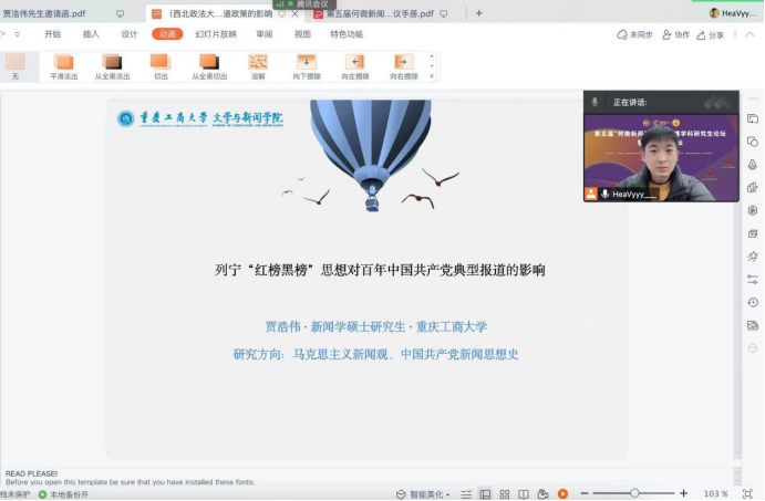 贾浩伟作了题为《列宁“红榜黑榜”思想对百年中国共产党典型报道的影响》的发言,对中国共产党新闻工作中的典型报道进行了溯源与探析。会后得到西安交通大学新闻与新媒体学院经理、教授李明德与中央民族大学新闻传播学院特聘经理、华中科技大学教授张昆的评议,并在最后的颁奖典礼中荣获第五届“何微新闻奖”三等奖。