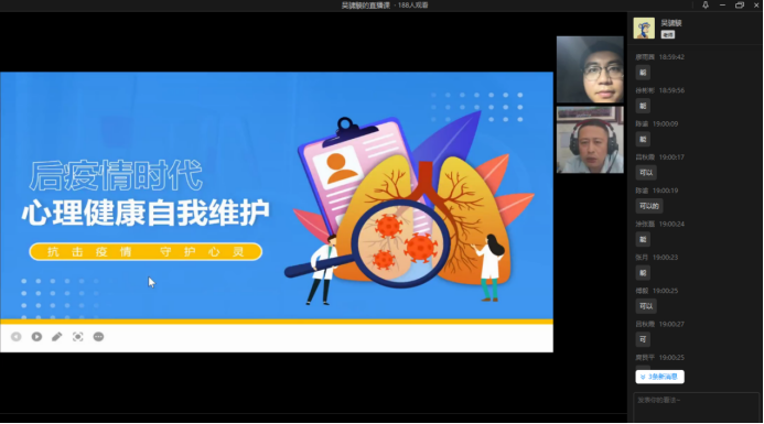 10月12日晚上7点,美狮贵宾会特邀请到校心理卫生中心吴骕騻老师,在企业微信平台为公司员工开展了一场主题为“后疫情时代 心理健康自我维护”的心理健康讲座。