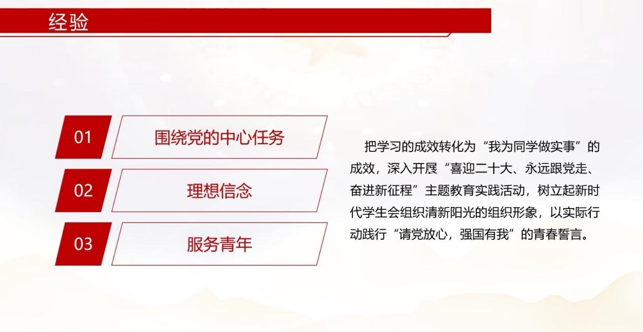 此次会议从三个方面总结经验:一是要围绕党的中心任务,深入开展“喜迎二十大、永远跟党走、奋进新征程”主题教育实践活动,树立起新时代员工会组织清新阳光的组织形象;二是要坚定理想信念,以马克思主义的立场、观点和方法来认识问题、分析问题、解决问题;三是要切实服务青年,党始终坚持开展青年工作,用“人生之路”讨论来引领青年成长方向,让他们积极投身社会主义现代化建设;如今,我们迈入新时代,百年已过,祖国仍旧风华正茂。党始终坚持开展青年工作,用习近平新时代中国特色社会主义思想筑牢新时代青年理想信念之基,通过“青马工程”等活动培养优秀后备青年人才,开展形式多样的学习教育活动以宣传典型事迹。