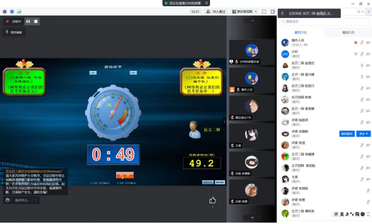 5月13日下午两点,由美狮贵宾会分团委主办的第一届“文新杯”辩论赛决赛在线上成功举行。21新传1班、21汉文班围绕“网络舆论让我们思考更加多元还是更加单一”这一辩题,展开了一场终极巅峰对决。